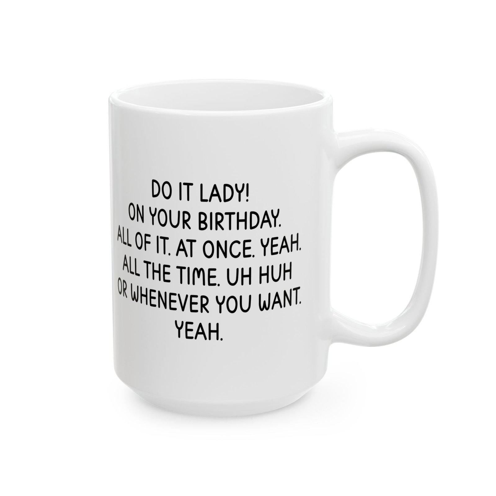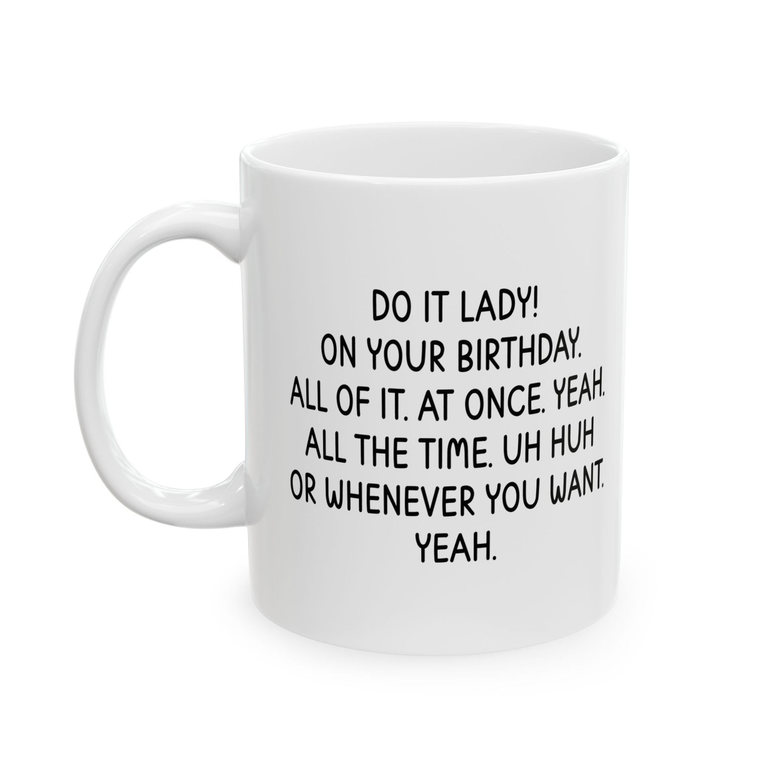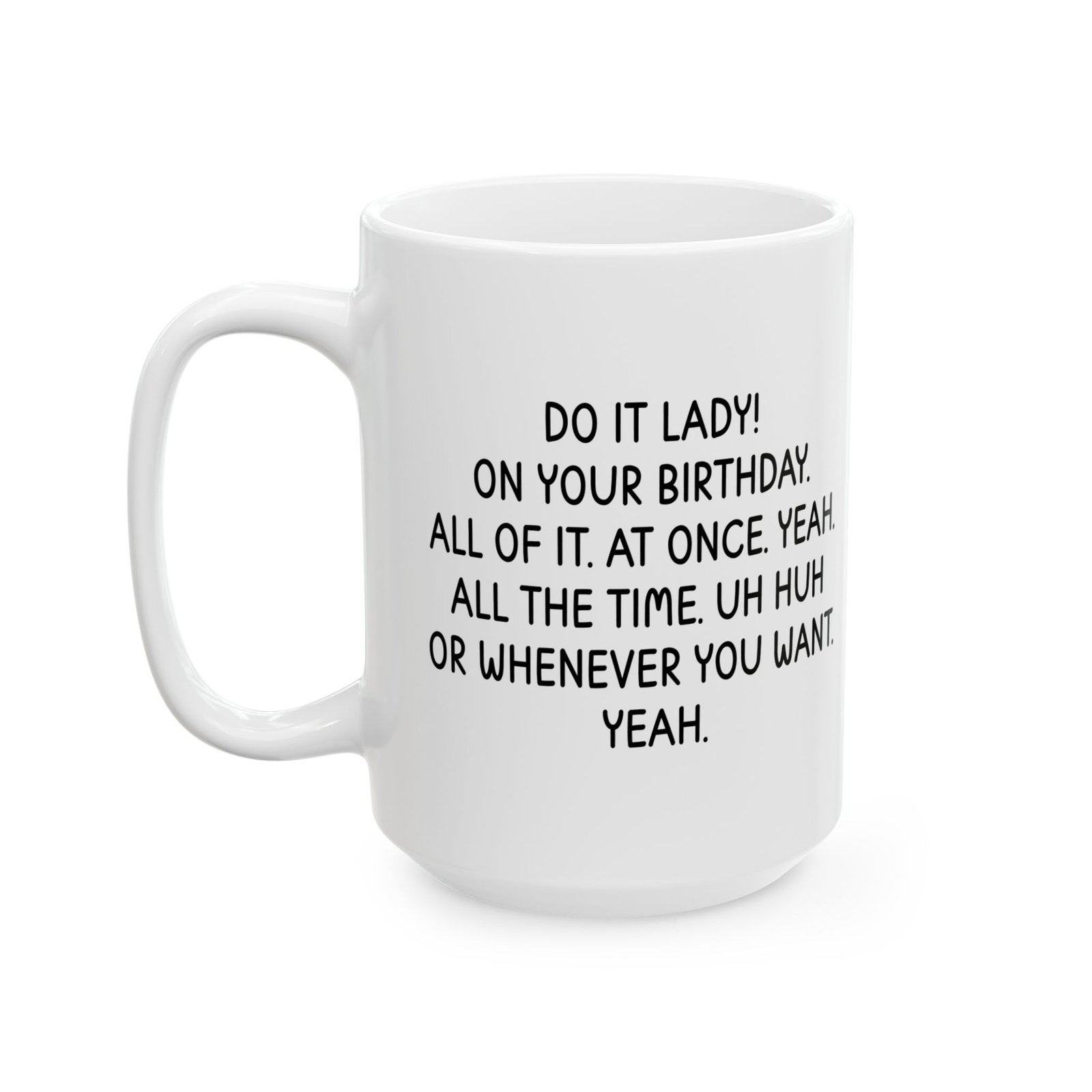 Bring energy and humor to every sip with the “DO IT LADY! ON YOUR BIRTHDAY. ALL OF IT. AT ONCE. YEAH. ALL THE TIME. UH HUH OR WHENEVER YOU WANT. YEAH” Mug. This bold and quirky coffee mug makes the perfect gift for birthdays, office laughs, or any celebration that calls for an over-the-top motivational shout. Crafted from durable ceramic, it’s dishwasher and microwave safe for everyday use. Great for coffee, tea, or any hot drink, this novelty mug will keep the laughs flowing whether you’re celebrating a birthday or just powering through the day. Perfect for friends, coworkers, or anyone who loves a little extra attitude with their caffeine.